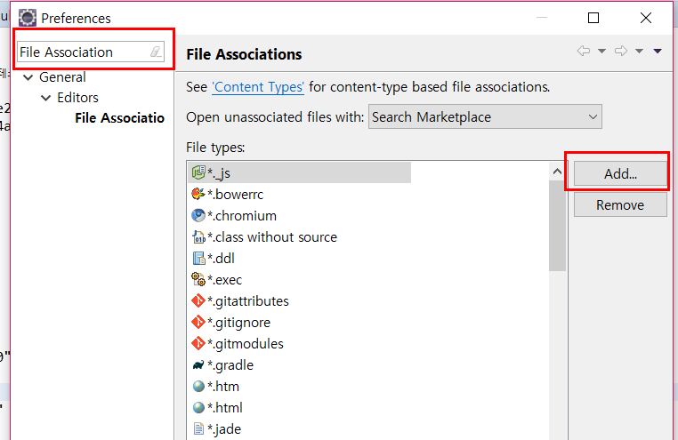 1. Window - Preferences 메뉴를 클릭 후 검색창에서 File Association을 입력하면 관련 메뉴(경로 : Generel - Editors - FileAssociation) 가 표시됩니다.