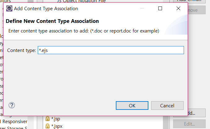 4. 다시 *.ejs 를 선택해주고, Add 버튼을 클릭해서 앞에서 봤던 Associated editors를 추가해줍니다.