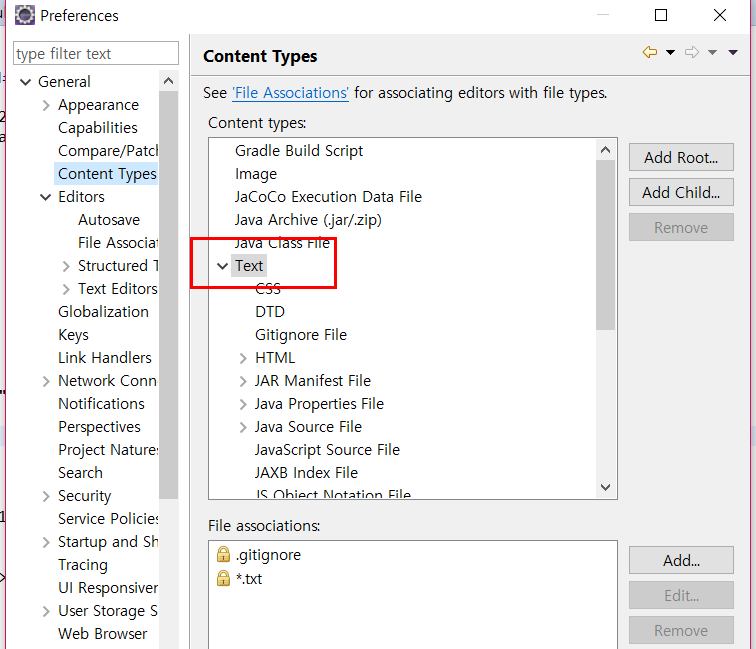 (File Associations 설정화면 상단의 'See Content Type..'을 클릭하거나 Window - preferences 메뉴의 General - Content Types 를 클릭해서 이동)