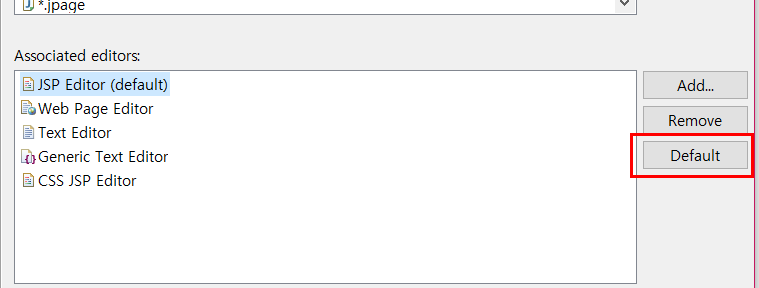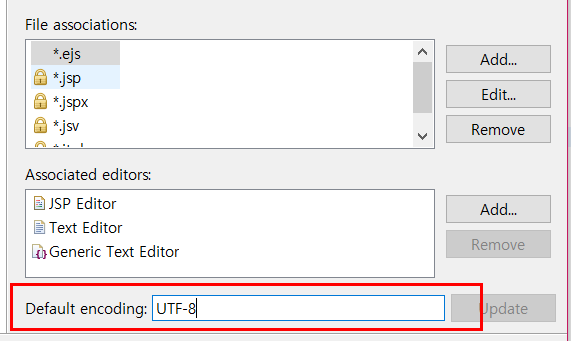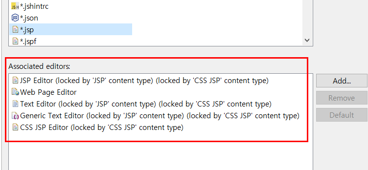 3. File Assocation에서 *.jsp (혹은 *.html)를 찾아서 클릭하면 해당 파일타입에 적용된 Associated editors 가 하단에 표시됩니다. 파일 타입을 캡쳐 등을 이용해서 기억해놓습니다. (ejs 파일에 동일한 editor를 추가해줘야 함)