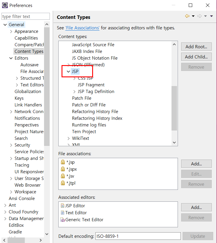 Text 밑에 JSP를 클릭해서 확장한 후 File Assorcation의 Add 버튼을 클릭합니다.