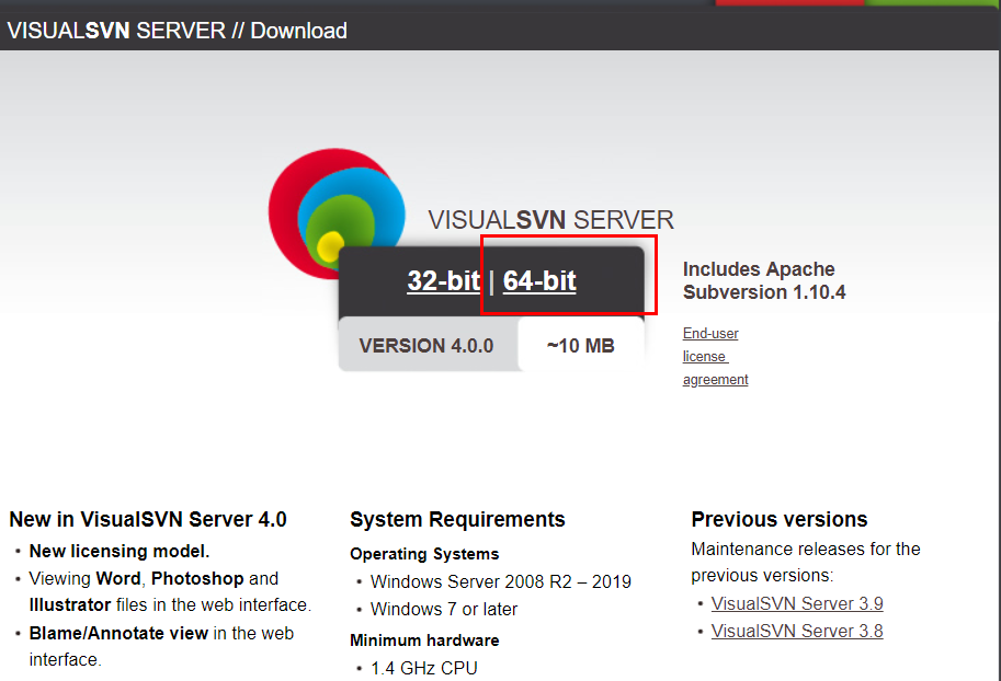 New in VisualSVN Server 4.0 New licensing model. Viewing Word, Photoshop and Illustrator files in the web interface. Blame/Annotate view in the web interface. Read the full release notes... System Requirements Operating Systems Windows Server 2008 R2 – 201