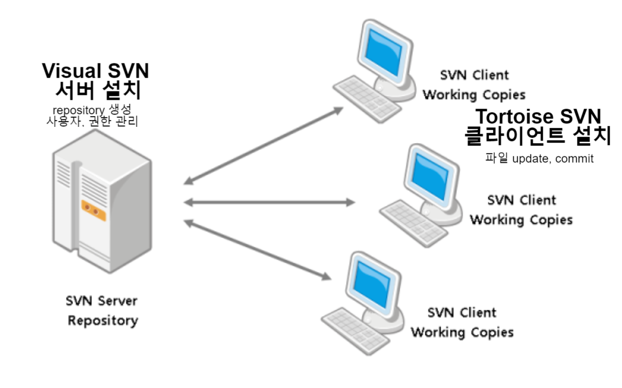 특정 서버 PC에 Visual SVN 서버를 설치하고 Repository를 만들면, SVN을 이용해서 공동으로 작업하려는 사용자들의 PC에 Tortoise SVN 클라이언트 툴을 설치하고 레파지토리를 Checkout 받은 후에 파일을 update 및 commit 하는 거죠.