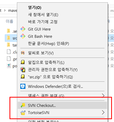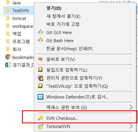 정상적으로 설치된 경우 폴더에서 우클릭시 SVN Checkout, TortoiseSVN 이 표시됩니다.