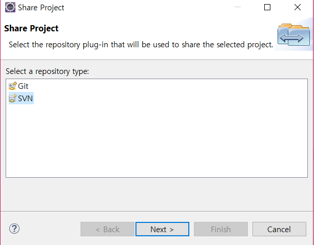 혹시 Repository type에 SVN이 표시되지 않는다면 이클립스에 SVN 플러그인이 설치되어 있지 않은겁니다. Help Eclipse Marketplace..에서 svn으로 검색해서 설치하시면 됩니다. 설치하는건 간단해서 설명을 생략하겠습니다.
