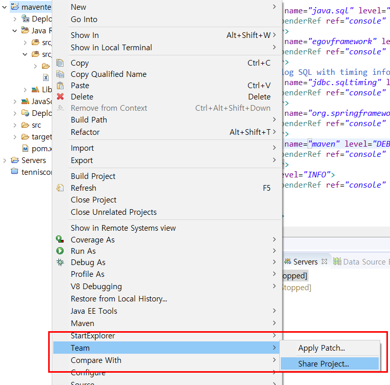 소스형상관리할 프로젝트에서 마우스 우클릭 후 Team - Share Project를 클릭합니다.